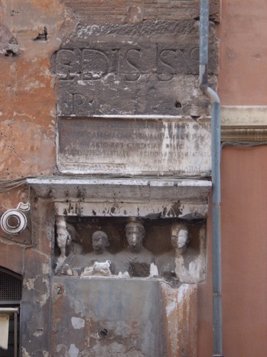 なんと! しっくいと塗料の下から、かつてその建物に刻まれていたらしい装飾彫刻と碑文とが顔を見せている。ローマ時代のものらしく見えるが、わたしは専門家ではないので、わからない。ローマの影響を受けた中世、ルネッサンスのものかもしれない。どちらにせよ、ずいぶんと歴史のある建物であることは確かのようだ。数百年前の建築なのだろうか? それにしても、もう少しまともに漆喰や塗料を塗れなかったのかねえ……古代の装飾を活かすんなら活かす、あるいは完全に塗りつぶす、のどちらかにするのが普通だと思うが、あまりに中途半端で、ちょっとホラーですらある。