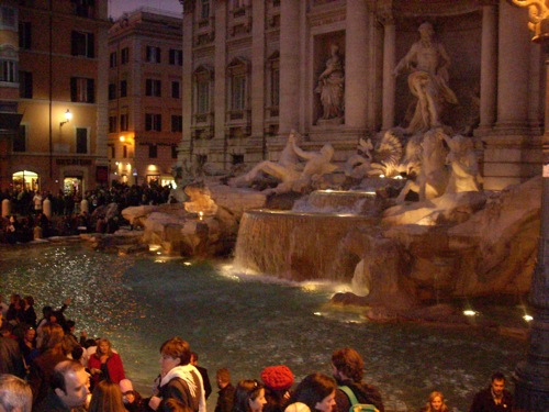 市内をうろうろしているとあっというまに暗くなってきた。気づけば偶然にもローマきっての観光名所のひとつ、トレヴィの泉の近くに来ている。あの、後ろ向きにコインを投げ入れると願いが叶うとかいうおまじないで有名な泉です。同行の友人が、ローマに来た記念にどうせだから行ってみようというので、そちらへ向かう……が、泉のある広場から数百メートル離れた時点で既になんだかものすごい
