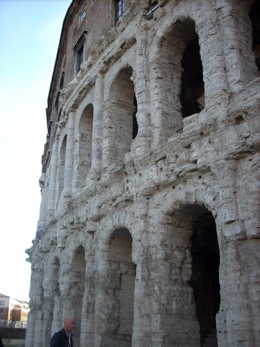 そしてこれは、ローマ時代に建造されたという劇場を、いまも使用中の建物の土台として使っている例だそうです(と、近くの看板に書いてあった)。いかにも年月を経たっぽい、いくつものアーチからなる部分がローマ時代の土台。その上の赤煉瓦が現在使用中の部分かな? それにしても二千年を経ていまだに使える土台を建てるとは、ローマの文化って恐ろしい。それも、当時の科学技術でだよ……。