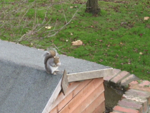 そんな話を聞くと、このカラスリスも憎たらしく見えてきますね!と思って眺めていましたが、やっぱりかわいいので写真をとっちゃったわけです。上の写真はとなりの庭の塀に上って、うちの庭に入り込もうか考えているところ。