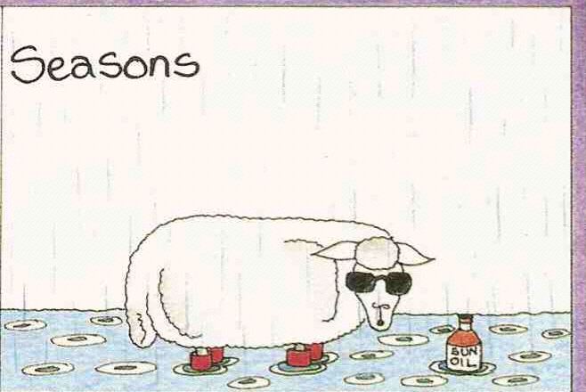 「冬」では黄色くなった目に世界に対する怨恨と開き直りが見てとれます。現実の羊もこんなふうに世界に対する挑戦的態度を見せてくれると楽しいのですが、羊はつくづく主体性というものを片鱗も感じさせない動物です。誰か一匹がなんかのひょうしに走り出すと、理由もないのに十頭も二十頭もドタドタ走ってついてってしまいます。キリスト教における羊飼いと羊の比喩とか、ほんと良く言ったもんだよ。イギリスは迷える羊だらけですよ。ちなみに、UKとかアイルランドで緑の丘に遠目から白い点々が見えたら、それは十中八九、羊です。ほんと、どこにでもいます。ほんとに、どこにでもいます。